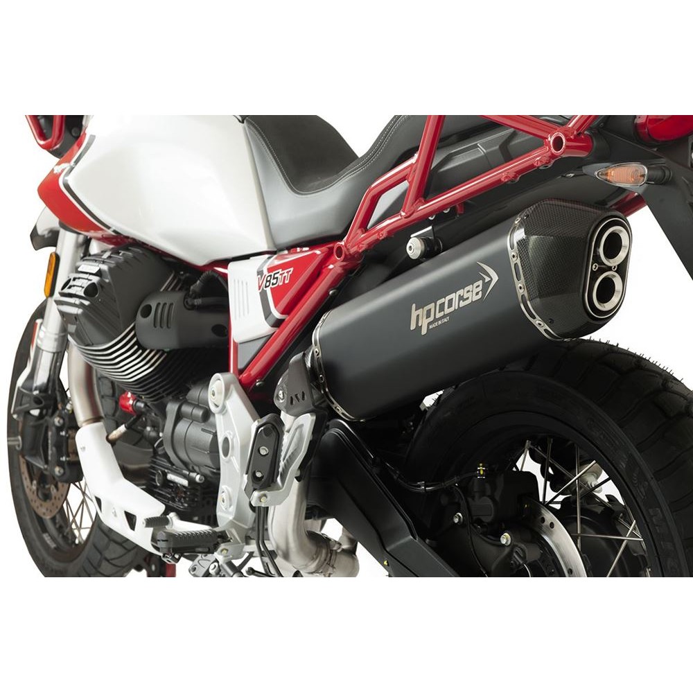 Μια μοτοσικλέτα που γεννήθηκε για να ικανοποιήσει τα πνεύματα που αναζητούν την περιπέτεια. Η GUZZI V85 TT παραπέμπει αμέσως στην ατμόσφαιρα των μεγάλων «μαραθωνίων» όπως το Ντακάρ και σε όλους εκείνους τους αγώνες που έχουν γράψει την ιστορία της μοτοσικλέτας «OFF», προσφέροντας μια τέλεια σύνθεση μεταξύ της αρχαίας γοητείας που δίνει η μάρκα Eagle και των δυναμικών γραμμών ενός «μοντέρνου κλασικού». Η GUZZI V85 TT είναι η ιδανική μοτοσικλέτα για κάθε είδους ταξίδι και για αυτόν τον λόγο έχει συγκινηθεί από μια εξαιρετική επιτυχία στο κοινό. Η HP CORSE έχει αφιερώσει μία από τις τελευταίες δημιουργίες της σε αυτόν τον υπέροχο εκπρόσωπο του «made in Italy» και στον εγκάρσιο κινητήρα V στις 90° και 853 cc, την εξάτμιση SPS CARBON ικανή όσο καμία άλλη να ανταποκριθεί στο πνεύμα και τον χαρακτήρα αυτής της νέας Guzzi. Η SPS CARBON παρουσιάζει ένα έργο που έχει βρεθεί στο επίκεντρο πολλών ωρών οδήγησης και χιλιάδων χιλιομέτρων σε όλα τα είδη εδάφους και δρόμων. Μια εξάτμιση ικανή να εγγυηθεί αντοχή και αξιοπιστία, καθώς και εξαιρετική ροπή και ανώτερη απόδοση, ιδιαίτερα σε χαμηλές και μεσαίες ταχύτητες. Η SPS CARBON αλλάζει το στυλ της V85 TT, κάνοντάς την πιο αεροδυναμική στο πίσω μέρος, καθώς και ελαφρύτερη και ικανή να ξεφεύγει ακόμα καλύτερα ανάμεσα σε καμπύλες, αλλαγές κατεύθυνσης και φουρκέτες. Διατίθεται σε τρία διαφορετικά υλικά: τιτάνιο, ανοξείδωτο ατσάλι με μαύρη κεραμική επίστρωση, σατινέ ανοξείδωτο ατσάλι.